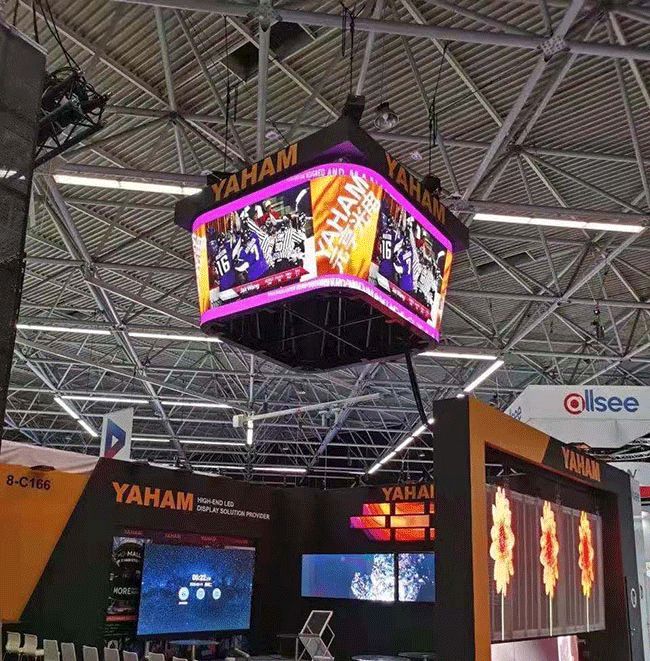 体育屏作为元亨本届展会的参展主题,在整个展会上稳站C位,围栏屏、檐板屏两大常规热销体育屏以其高稳定性、高刷新以及独特的箱体设计等特点吸引了客户的目光。而悬挂在展位正中央的元亨CH系列吊斗屏依靠颜值与实力征服每一位现场观众。 这款吊斗屏采用两种箱体材质设计,其中主箱体为型材箱体,而为了确保箱体之间无缝连接,屏体顶部及底部箱体则采用钣金箱体。为了最大限度消除画面颗粒,元亨光电这块吊斗屏摒弃行业中转角以及异形屏经常采用的6mm以上像素间距产品,改用4mm像素间距的产品。3840Hz高刷新率,能同步于高速摄像机捕捉精彩镜头,有效避免摄制时产生的摩尔纹,使转播画面更加清晰流畅。16nits的高灰度等级,极致还原画面本真色彩。